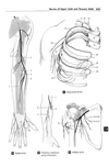 胸前皮枝(肋間神経の)【きょうぜんひし(ろっかんしんけいの)】 Cutaneous branches emerging anteromedially.(肋間神経の胸の前皮枝は脊髄神経枝(肋間神経T1-T6)の枝で、外側皮枝より遠位で分かれ胸骨傍線の位置で2分して内側の胸骨枝と外側の乳腺枝になり、前胸壁に分布する神経枝。)