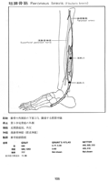 浅腓骨神経【せんひこつしんけい】 Terminal branch of the common fibular nerve. It descends between the peroneus muscles and extensor digitorum longus.(浅腓骨神経は総腓骨神経の終枝の一つ、腓骨筋と長趾伸筋の間を下行する。 (Netter)浅腓骨神経は、長趾伸筋と腓骨筋の間を下行し、長腓骨筋と短腓骨筋に筋枝を出した後、下腿の虫部から下部1/3に移る高さで下腿筋膜を貫く。この高さで、浅腓骨神経は、内側足背皮神経と中間足背神経とに分かれる。内側足背皮神経は足根の前面を走行して足背に至り、下部下腿前面と足背の皮膚と筋膜に枝を送る。下伸筋支帯の下縁近くで、この神経は2本の足背趾神経に分岐する。このうち1本は、足背および母趾の内側面と背側面を支配し、他の1本は第2,第3趾の背側面と側面とを支配する。中間足背皮神経は、足背外側部に沿って走行し、近傍の皮膚や筋膜に枝を出し、第3と第4趾および第4と第5趾に行く2本の足背趾神経に分かれる。また、中間足背皮神経は、外側足背皮神経と交通する。)