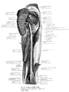 筋枝(脛骨神経の)【きんし(けいこつしんけいの)】 Branches to the gastrocnemius, plantaris, soleus, and deep flexors of the leg.(脛骨神経の筋枝は腓腹筋の2頭、足底筋、ヒラメ筋、膝窩筋に侵入する。)