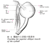 上斜筋;上眼球斜筋【じょうしゃきん;じょうがんきゅうしゃきん】 o:Medial to the common tendinous ring on the body of sphenoid, i: After a hook-shaped course, obliquely behind the equator. Its tendon passes through the trochlea. Action: Abduction, intorsion, and depression of the eye. I: Trochlear nerve.(上斜筋は眼窩傍結合組織すなわち視神経鞘と(おもに)蝶形骨体の結合組織である総腱輪の内側から起こる。上斜筋は眼窩錐体の内側直近の上を前方に走行する。眼球の縁で上斜筋の丸みのある腱は結合組織性の吊り索(滑車)を通過し鋭角で後方に曲がる。さらに上斜筋の腱は上直筋の下でこれと交差し眼球上後側頭部の強膜に停止する。目の動き:視線を内側かつ下方に向ける。)