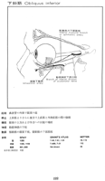 下斜筋;下眼球斜筋【かしゃきん;かがんきゅうしゃきん】 o:Lateral alongside the nasolacrimal canal, i: Behind the equator. Action: Gaze elevation, abduction, and extorsion. I: Oculomotor nerve.(下斜筋は眼窩口内側縁の後方の上顎骨に存在する前涙嚢稜から起こり眼窩下縁と並行に走る。下斜筋は停止部近くで扇のように後方へ放射状に広がり眼球の下後側頭部眼球赤道の強膜に停止する。目の動き:視線を内側かつ上方に向ける。)