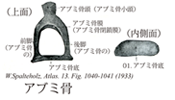 アブミ骨;鐙骨【あぶみこつ】 Stirrup-shaped ossicle, the base of which is integrated into the oval window.(アブミ骨は3つの耳小骨のうち最小のもので、底部は前庭窓についている。アブミ骨頭、前脚、後脚、アブミ骨底を区別する。頭部はキヌタ骨の長肢の豆状突起と関節で結合する。)