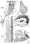 毛包;毛嚢【もうほう;もうのう】 Sheath of connective tissue and epithelium enclosing the root of the hair.(毛包とは毛根を包む組織で、毛嚢ともいう。毛根にじかに接する部分を上皮性毛包といい、その外側をなす真皮の連続部を、結合組織性毛包または毛袋という。両者の間に丈夫な基底膜の一種である硝子膜があり、これは電顕的な基底板の外側に、厚い結合組織基質と細い膠原線維が緻密になったものである。毛袋は2層に分けられ、膠原線維の走向によって、内輪層と外縦層と呼ばれる。上皮性毛包は表皮の連続が毛根を包む部分であるが、その内包は角化する内根鞘で、外包は表皮直下のいわゆる峡部とよばれるところから上は角化するが、大部分は角化しない外根鞘である。内根鞘はさらに3層にわけられ、外から順にHenle層または淡明上皮層、Huxley層または顆粒上皮層と根鞘小皮に分けられる。内根鞘の外包2層の細胞には表皮のケラトヒアリン顆粒に類似したトリコヒアリン顆粒trichohyalin granuleが出現するが、Henle層の方が速く角化するので、角化してしまうと顆粒はみえなくなる。多くの毛根の結合組織性毛包には立毛筋、脂腺、また特定の部位ではアポクリン汗腺が付着している。)