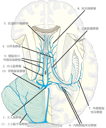 上視床線条体静脈は視床と尾状核の間の溝を前方へ走る長い静脈で、付着板におおわれ、外側から数条の横尾状核静脈が流入し、Monro孔の尾側壁で脈絡叢静脈および透明中隔静脈と合して内大脳静脈となる。