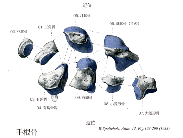 197_06【Scaphoid bone舟状骨(手の) Os scaphoideum; Os naviculare manus】 Bone situated between the lunate and trapezium. →(手の舟状骨は手根の近位列の最大の骨で、外側(橈側)にある。橈骨、月状骨、有頭骨、大菱形骨、小菱形骨と関節する。上面(近位面)は橈骨に向かう凸な、下面(遠位面)は有頭骨に向かう凹な関節面で大部分を占められ下外側端に大小菱形骨に対する関節面がある。)