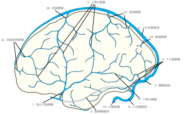 浅中大脳静脈は外側溝に沿って走る静脈で、大脳半球の外側面からの小さい静脈がこの静脈に注ぎ込む。この太い浅中大脳静脈は、海綿静脈洞にそそぐ。また浅中大脳静脈には吻合枝が存在する。この吻合枝のなかで殆ど常在する顕著な吻合静脈は、上吻合静脈と下吻合静脈である。大脳半球の下面と内側面の皮質の大部分の血液は、多数の小さい静脈によって、内大脳静脈または大大脳静脈にはいる。浅大脳静脈系と深大脳静脈系を結合する吻合静脈として脳底静脈、後頭静脈、後脳梁静脈がある。これらの静脈は深大脳静脈に関連させて考察するのが一番よい。