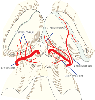 内側後脈絡叢動脈は中脳をとり巻いて松果体の領域に達し、中脳視蓋、第三脳室脈絡叢、視床の上面と内側面に枝を出す。