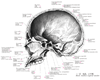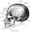 頭蓋;ズガイ【とうがい;ずがい】(頭蓋は日常語として一般にズガイと読まれているが、1943年(昭和18年)制定の医学用語、解剖学用語ではトウガイと読むことに定められた。しかし日常語としてのズガイも併用されている。 頭蓋は15種23個の骨、すなわち10種16個の頭蓋骨および5種7個の顔面骨の連結により形成されている。また頭蓋は5種7個の脳頭蓋(神経頭蓋)および10種16個の顔面頭蓋(内臓頭蓋)にも分類されている。 頭蓋骨(10種16個)を形成する骨は、後頭骨(1個)、蝶形骨(1個)、側頭骨(1対2個)、頭頂骨(1対2個)、前頭骨(1対2個)、篩骨(1個)、下鼻甲介(1対2個)、涙骨(1対2個)、鼻骨(1対2個)および鋤骨(1個)である。顔面骨(5種7個)を形成する骨は、上顎骨(1対2個)、口蓋骨(1対2個)、頬骨(1対2個)、下顎骨(1個)および舌骨(1個)である。 頭蓋は頭蓋冠と頭蓋底にもわけられているが、前者は頭蓋腔を円蓋状におおい、後者は頭蓋の底部をなし、両者の境界に冠する緒学者の見解は一定していないが、一般には外後頭隆起、上項線、外耳孔上縁、側頭下稜、眼窩上縁、鼻棘をむすぶ環状線をもって境界と定めている。頭蓋腔を円蓋状におおい、後者は頭蓋の底部を成し、両者の境界に関する諸学者の見解は一定していないが、一般には外後頭隆起、上項線、外耳孔上縁、側頭下稜、眼窩上縁、鼻棘を結ぶ環状線をもって境界と定めている。頭蓋腔の容積は1,200~1,500mlであるが、性差があり、女は男より約10%少ない。なお頭蓋腔の大きさは、脳の大きさに密接な関係をもっている。頭蓋の形態は個人差、年齢差、性差などのほかに人種差もあり、これは人類学的に重要な意義を有している。骨格のうちで最も人種の特徴の差違が著明に現れるのは頭蓋であるといわれている。頭蓋の人種間の差違を具体的に表すために、18世紀末より頭蓋計測がおこなわれてきたが、多数の計測値のうちで最も重要なものは最大脳頭蓋幅径を最大脳頭蓋長で除して、その値に100を乗して得た頭蓋長幅示数である。この数の値によって頭蓋を長頭(74.9以下)、中頭(75.0~79.9)、および短頭(80.0以上)の3型に大別することができる。頭蓋骨間の連結には下記の4種がある。(1)縫合:15種23個の骨のうち、下顎骨と舌骨とを除いたすべての骨は、縫合という骨間結合組織によって不動結合をなす。頭蓋には34種の恒常性の縫合がある。(2)軟骨結合:頭蓋底の軟骨性原始頭蓋すなわち後頭骨、蝶形骨、側頭骨にみられる不動結合で5種ある。(3)靱帯結合:側頭骨の茎状突起と舌骨との間にある頭蓋で唯一の靱帯結合すなわち可動結合である。(4)関節結合:下顎頭と側頭骨下顎窩との間にある頭蓋で唯一の関節すなわち可動結合である。)
