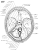 中頭蓋窩【ちゅうとうがいか】 Fossa that is bounded by the lesser wing of the sphenoid and by the superior border of the petrous part of the temporal bone.(中頭蓋窩は蝶ネクタイのような形をした窩みで、主として蝶形骨からなるが、後外側部を構成するのは側頭骨である。中頭蓋窩の中央部は蝶形骨体の上面からなり、中頭蓋窩の中で特に隆起している。その前方は鞍結節、後方は鞍背として高まり、中央がくぼんでトルコ鞍となる。その中央に下錐体をのせる下垂体窩がある。鞍結節の前の視神経交叉溝の両側は視神経管に達する。両側部は蝶形骨大翼と側頭骨鱗部の大脳面、および岩様部(錐体)前面からなり、大脳側頭葉を容れる深いくぼみとなる。脳隆起と指圧痕が著しく、また、棘孔からひろがる動脈溝、静脈溝(中硬膜動静脈を容れる)が明瞭である。外側部が特に前方に陥入する前端、すなわち小翼と大翼の間に上眼窩裂がある。トルコ鞍の側面には内頚動脈溝が前後に走り、その後端は蝶形骨と岩様部(錐体)尖の間にある破裂孔に至る。内頚動脈溝の外側に、前方より後外方に向かって、正円孔、卵円孔、棘孔が並ぶ。破裂孔から後外方に、大翼と錐体の間にある蝶錐体裂がつづく。その内後方にある大錐体神経溝の前端は破裂孔に達し、小錐体神経溝は蝶錐体裂の後端から卵円孔に向かう。錐体前面には、そのほか、三叉神経圧痕、弓状隆起、鼓室蓋がみられる。中頭蓋窩は多くの管、孔によって蓋部と交通する。①視神経管により眼窩へ(視神経および眼動脈)、②上眼窩裂により眼窩へ(動眼神経、滑車神経、外転神経、眼神経、上眼静脈)、③正円孔により翼口蓋窩へ(上顎神経)、④卵円孔により側頭下窩へ(下顎神経)、⑤棘孔により側頭下窩へ(中硬膜動静脈および下顎神経硬膜枝)、⑥破裂孔の後壁に開く頚動脈管により頭蓋底外面へ(内頚動脈は破裂孔を通らず、頚動脈に至る)、⑦破裂孔より頭蓋底外面へ(ただし、生体では破裂孔の底面は線維軟骨で閉鎖され、その上に頚動脈が乗る。大錐体神経も軟骨を貫かず、翼突管に入る)。)