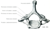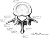 椎弓【ついきゅう】 It forms the posterior and lateral boundaries of the vertebral foramen.(椎弓は椎体から後方に向かって出る鱗状の部で、椎体につく椎弓根と、それより後の板を曲げたような椎弓板に分ける。)