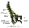 仙骨;仙椎[1-5]【せんこつ;せんつい[1-5]】 The sacrum consists of five fused vertebrae.(骨盤の後壁をつくる幅広い三角状の骨で脊柱のうちで最も大きい。青年期までは軟骨結合をいとなむ5個の仙椎と肋骨片とが癒合した物で、後方に向かって軽く凸弯している。骨盤腔に面する前面は平滑であるが後面は凸凹に富み3種5条の縦の隆起がある。このうち、正中仙骨稜は棘突起が、中間仙骨稜は関越突起が、外側仙骨稜は横突起がそれぞれ結ぶ靱帯の骨化とともに癒合したものである。中間仙骨稜は下方に延びて仙骨角を形成し、仙骨管の下口である仙骨裂孔を左右から囲んでいる。椎孔が上下に連なってできた仙骨管はそれぞれ4対の前仙骨孔と後仙骨孔によって仙骨の前・後面に通じており、前者を仙骨神経前枝、後者を仙骨神経後枝が通る。また、左右の前仙骨孔の間にある4本の横線は5個の仙椎椎体の癒合した痕である。仙骨底中央の第1仙椎椎体の上面のうち、最も前方に突出している点、すなわち岬角は骨盤の計測点して用いられる。仙骨の上関節突起および前・後仙骨孔より外側の部分は仙椎の横突起と肋骨片が癒合したもので外側部という。外側部の上半には耳状面とよばれる広い関節面があって寛骨と連結する。また、耳状面の後方の仙骨粗面は凸凹に富み、靱帯g付着する。仙骨の形や大きさは男女によって異なり、女性の仙骨は男性の仙骨より幅が広くて上下に短く、弯曲度が小さい。しかし、日本人の場合には白人ほど顕著ではない。仙骨には第一仙椎の腰椎化(完全分離の頻度6~7%)、第5腰椎の仙骨化(完全癒合の5%)がみられるが、第一尾椎が尾骨と癒合することもある。Sacer(神聖)に由来する。)