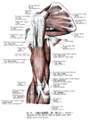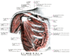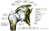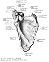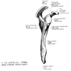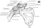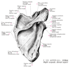 烏口突起【うこうとっき】 Hooked process that projects anteriorly from the superior border of the scapula just lateral to the suprascapular notch. Attachment site of the pectoralis minor muscle and origin of the short head of the biceps brachii and coracobrachialis muscles.(肩甲切痕と関節窩の間には、烏の嘴のように折れ曲がった烏口突起が前外側方に突出している。烏口突起は烏口腕筋と上腕二頭筋(の短頭)が起こり、また小胸筋が付くための突起である。Koraxというギリシャ語は烏(または烏の嘴ように曲がったもの-ドアの把手など)を意味する。)