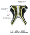 恥骨【ちこつ】 Bone involved in formation of the acetabulum and the anterior and inferior borders of the obturator foramen.(恥骨は寛骨の前下部を占める。恥骨体、恥骨上枝および恥骨下枝の3部に分けられる。寛骨臼の前方約5分の1と寛骨の前下方部を形成し、対側の恥骨と恥骨結合面で軟骨(線維軟骨)結合をする。長楕円形の恥骨結合面を含む前上部が恥骨体である。丸みをおびた恥骨体上縁の外側端にある隆起が恥骨結節で、恥骨結節から恥骨結合面へ向かう、恥骨体前面との移行部の粗な隆線が恥骨稜である。恥骨体の上外側から後上外側へ伸び、寛骨臼に達する三角柱状の部分が恥骨上枝である。恥骨上枝上面(櫛状面)は三角形を呈す。恥骨結節から寛骨臼部へいたる、上面外側前方の丸みをおびた隆線が閉鎖稜であり、恥骨結節から後上外側の橈骨との癒合部を示す粗な隆起へいたる、上面内側後方の稜線が恥骨櫛である。腸骨との境界部は肥厚しているが、寛骨臼前下縁にいたる、とくに肥厚した部分が腸恥隆起である。恥骨櫛・恥骨稜は分界線の恥骨部をなす。内側面(骨盤面)は恥骨櫛と、鋭利縁をなす下縁との間の平滑な面で、外側部で幅が狭くなる。下面(閉鎖面)には内側面下後方から下面前下方へ向かう閉鎖溝がある。閉鎖溝は前方が閉鎖稜で、後方は下縁で境される。下縁中央部で、やや後方へ突出した小隆起が前閉鎖結節である。生体では前閉鎖結節と後閉鎖結節との間に、閉鎖膜の上縁をなす線維束が張って閉鎖溝の底となり閉鎖管を形成する。腸骨体の下外側から後下外側方へ伸びる扁平な部分が恥骨下枝で、坐骨枝と癒合し閉鎖溝の下縁をなす。癒合部は粗な隆起部として残ることがある。恥骨下枝の上縁は鋭いが、下縁は被厚し粗面をなす。下縁の内側部が粗に隆起して陰茎稜を示すことがある。ラテン語のPubes(陰部)に由来する。Pubesはpuberty(思春期)の語でわかるように、元来は成人の意味で、これから成人のシンボルである陰毛(pubes)のこととなった。このpubesはやがて陰部を指すようになり、その所有格によって「恥部の骨」os pubisの名が生まれた。)