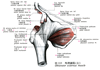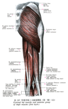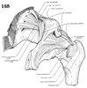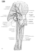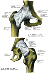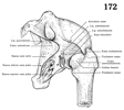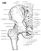 大転子(大腿骨の)【だいてんし(だいたいこつの)】 Large prominence on the superolateral aspect of the femur for attachment of the gluteus medius, gluteus minimus, and piriformis muscles.(大腿骨頚の上外側には大転子(中臀筋、小臀筋、梨状筋がつく)が突出している。転子とはハンドルのことで、その力学的な効用は、たとえば大転子につく中臀筋が大腿骨を外転させている。)