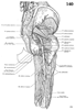 粗線;大腿骨稜【そせん】 Rough double line on the posterior aspect of the femur. It increases the bending strength of the shaft and gives origin to the vastus medialis and vastus lateralis muscles, the short head of the biceps brachii muscle, as well as attachment to the adductors, gluteus maximus, and pectineus muscles.(大腿骨体の前面は平滑でスベスベした隆起が縦走している。粗線は内側唇と外側唇の2部からなり、この両者は上方と下方とで二またにわかれている。粗線は人類だけに見られる特徴的なものである。これは人類では直立歩行をするために必要な筋群が発達し、これらの筋の付着部である粗線が強く隆起するに至ったのである。粗線の有無は、化石猿人が直立歩行をしていたか否かの決定的な参考にされる。)