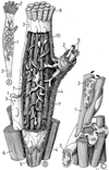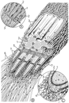 腱【けん】 (筋の末端は筋線維が次第に結合組織線維に変わって紐あるいは帯状を呈する構造。起始は・停止はしばしば種々の長さの伸縮性のない線維性のひもあるいは帯で、筋肉の一部を構成し筋腹部分を骨その他の付着対象物に結合している。腱は著しく長いことがある。筋の長さは筋腹だけでなく腱の部分も含めて測定する。腱はあきわめて緻密に平行にそっろったコラーゲン線維の束からなり細長い線維細胞が縦列をな基質はきわめて少ない。)