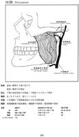 咬筋【こうきん】 The most prominent masticatory muscle. It acts to close the mouth and, together with the temporal and medial pterygoid muscles, determines the level of masticatory force. It consists of the following two parts.(咬筋は最も浅層にある咀嚼筋である。浅部と深部の2部からなり、浅部は強い腱で頬骨弓の前3分の2の下縁と内面から起こり後下方に向かい、深部は頬骨弓の後3分の2の下縁に垂直に下り向かい下顎枝および下顎角の外面に付く。作用は下顎骨を引き上げて歯をかみ合わせる。咬筋は強大な筋で、歯をかみ合わせると、体表からみることができ、かつ触れることができる。)