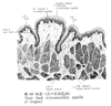 舌筋【ぜつきん】 (舌筋はすべて横紋筋であって外舌筋(オトガイ舌筋、舌骨舌筋、茎突舌筋)、内舌筋(上縦舌筋、下縦舌筋、横舌筋、垂直舌筋)があるが、その舌内にある部分はいずれも、他の筋と異なって多数の脂肪細胞を含む疎性組織により多くの小束に分かたれ、そのために下は軟らかくかつ自由に動きうる。舌筋の作用はオトガイ舌筋のおもな作用は舌を前方に突出させ、また舌の中央部を舌に引く。舌骨舌筋および茎突舌筋のおもな作用は舌を後に引き込ますが、同時に舌骨舌筋は舌の側縁を舌に引き、茎突舌筋は舌背を高める。またこの3筋が一側だけ動けば舌を外側に曲げる。上下の縦舌筋は舌を短縮させ、横舌筋は狭くすると同時に延長させる。垂直舌筋は舌を平らにする。舌筋は舌根ではやや複雑な走向ををとるが、全体としてはほぼたがいに直行する三つの系列にわけられ、それぞれ前後(上縦舌筋、下縦舌筋、茎突舌筋、舌骨舌筋など)、左右(横舌筋、口蓋舌筋、茎突舌筋の一部、上咽頭収縮筋舌咽頭部など)、上下(垂直舌筋、オトガイ舌筋、小角舌筋、舌骨舌筋の一部など)に走る。前後に縦走する系列は比較的舌の表面近くを走り、全体としては他の系列を外からかこむような傾向で配列する。)