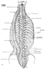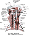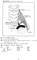 後斜角筋【こうしゃかくきん】 o:Transverse processes of C4-C6. i: Upper margin of second rib. Elevation of the rib. Lateral flexion of the neck. I: Brachial plexus (C7 C8).(後斜角筋は、C5とC6の横突起後結節から起こり、筋腹は中斜角筋の背側縁を廻って腹側に向きを変え、第2肋骨外面に、ときどきさらに第3肋骨に停止する。神経支配はC7およびC8由来の頚神経叢からの筋枝を受ける。参考:斜角筋群は主に吸息筋として働き頚椎を動かす作用はむしろ従であるという。)