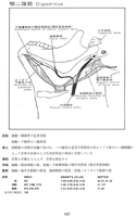 顎二腹筋【がくにふくきん】 o:Mastoid notch, i: Digastric fossa. It has an intermediate tendon that acts on the lesser horn of the hyoid bone by means of a connective tissue sling. Raises the hyoid bone and opens the mouth.(顎二腹筋は舌骨の上方にある細長い筋で中間腱で前腹と後腹との2腹に分かれる。その後腹をもって側頭骨乳突切痕で起始し、斜め前・下方へ走る。舌骨付近で後腹は中間腱に移行し、この腱は二分した茎突舌骨筋によって挟まれ、かつ線維性滑車によって舌骨に固定される。前腹(顎舌骨筋からは皮膚側へ位置しているが)は中間腱から起始し、下顎骨内面で下顎下縁近くの二腹筋窩に停止する。顎二腹筋の前腹(下顎神経の枝である顎舌骨筋神経の支配)と後腹(顔面神経の支配)とは神経支配が異なることは注意を要する。下顎が固定されているときには、舌骨を引き上げる。舌骨が固定されているときは下顎骨を後下方に引く。両者は発生学的にも由来を異にし、前腹は顎舌骨筋・口蓋帆長筋などとともに咀嚼筋と同類(鰓弓のうち顎骨弓mandibular archに属する筋)であり、後腹は茎突舌骨筋・アブミ骨筋などとともに顔面表情筋と同類(鰓弓のうち舌骨弓hyoid archに属する筋)である。ちなみに、咀嚼筋は下顎神経で支配され、顔面表情筋は顔面神経支配である。このように発生学的な由来を知れば、色々な筋の支配を整然と整理することができる。)