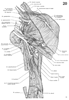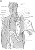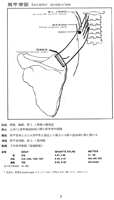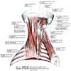 肩甲挙筋【けんこうきょきん】 o:Posterior tubercles of cervical vertebrae C1-C4. i: Superior angle of scapula. Raises the scapula; rotates the inferior angle of the scapula medially. I: Dorsal scapular nerve.(肩甲挙筋は、上位4つの頚椎の横突起から、斜角筋と板状筋の間で起こる。起始部は外側頚三角にに、細い筋個体としてみえる。この筋は僧帽筋で被われ、斜めに下行して、肩甲骨上角および、肩甲棘よりも上の肩甲骨内側縁に停止する。)