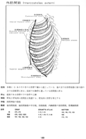 外肋間筋【がいろっかんきん】 Muscles that extend obliquely between the ribs from posterosuperior to anteroinferior. They are active during inspiration and fix the ribs. I: Intercostal nerves.(外肋間筋は、肋間筋の表層を形成する。この筋は肋骨結節から肋骨の骨軟骨境界に至るまで全肋間に分布する。この筋線維は後上から前下に向かって斜走する(外腹斜筋と同様に)。)