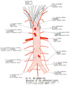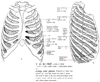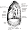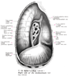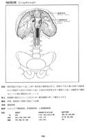 横隔膜【おうかくまく】 Dome-shaped musculofibrous septum dividing thoracic and abdominal cavities. I: Phrenic nerve.(横隔膜は胸腔と腹腔との境を作る膜状筋で、胸郭下口の周りから起こる。この起始部を腰椎部、肋骨部、胸骨部の3部に分ける。これらの部から出る筋束は全体として円蓋のように胸腔に盛り上がって集まり、中央部の腱膜につく。これを腱中心という。横隔膜の上面は胸内筋膜および胸膜と心膜、下面は横隔膜筋膜(横筋筋膜の一部)および腹膜(肝臓その他の臓器が接する部分を除いて)被われる。ドーム状の横隔膜は胸腔の床および腹腔の天井となる。閉鎖した筋腱様のしきりは哺乳類の特質である。横隔膜は最重要な呼吸筋である。筋素材は系統発生的に第3~5の頚部筋節から由来し、頚神経叢からの横隔神経(C4(3,5))に支配される。筋性横隔膜は腰椎部、肋骨部、胸骨部から形成される。)