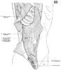 外腹斜筋【がいふくしゃきん】 o:Outer surface of the fifth through twelfth ribs, i: Iliac crest, inguinal ligament, rectus sheath, linea alba. Flexes the trunk, elevates the pelvis, raises intra-abdominal pressure, bends laterally, and rotates the trunk to the contralateral side. I: Intercostal nerves of fifth to twelfth ribs.(外腹斜筋の起始は下位8本の肋骨外側面から指状に出ている筋線維束。停止は最下部肋骨からの筋肉性の厚い線維は腸骨稜の外唇前半部に付着し、残りは前腹壁の広い腱膜に付着する。機能としては腹部の収縮、内臓の保護、強い呼気の場合も働く。神経支配は下部6本の胸神経と上部2本の腰神経の前枝。動脈は上および下腹壁動脈の筋枝より受ける。3つの側腹筋の中でもっとも広い領域を占める筋である。最初の起始筋束は、わずかに斜めに下る程度であるが、もっとも尾側の筋束は急角度で下方へ進む。腱膜への移行は、腹直筋の外側縁に並行に直線的に生じ、その線は、上前腸骨棘のやや頭側で急に直角あるいは鋭角に向きを変え、腸骨稜の上端に終わる。このようにして筋角が形成されるが、この角はしばしば皮膚の表面から認められ、古代の彫刻にも良く強調されている。この筋線維束は、筋が引き伸ばされない限りは腸骨稜を越えて膨出し、そのために骨盤の上縁をおおって鼡径隆起を形成する。多くの人において(男性より女性において頻度が高いが)広背筋は外腹斜筋に直接隣接しない。広背筋の前縁と外腹斜筋の後縁の間には尾側が腸骨稜によって境される三角形の領域、腰三角が形成され、この部位の腹壁は、内服斜筋と腹横筋にのみによって形成される。ここは、脊柱に生じ腸骨稜に沿って移動してきた膿瘍が、外へ逃げることが出きる場所であり、まれには(下)腰ヘルニアも出現する。)