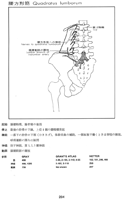 腰方形筋【ようほうけいきん】 o: Iliac crest, i: Twelfth rib, costal processes of lumbar vertebrae L1-L4. Draws ribs inferiorly, lateral flexion. I: Intercostal nerve of twelfth rib, lumbar plexus.(腰方形筋の起始は腸腰靱帯、腸骨稜の後部。停止は最後の肋骨の下縁、上位4個の腰椎横突起。機能として一番下の肋骨の下制(ひきさげ)、体幹屈曲の補助、一側単独で働くときは脊柱の側屈、呼吸運動の関与は疑問。神経支配は肋下神経、第1,2,3腰神経。動脈は腸腰動脈の腰枝から受ける。)