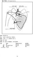 棘下筋【きょくかきん】 o: Infraspinous fossa of scapula, spine of scapula, infraspinous fascia, i: Greater tubercle of humerus. Lateral rotation, strengthens joint capsule. 1: Suprascapular nerve.(棘下筋は棘下窩(肩甲骨頚を縁どる部分は除く)から起こり、肩関節包と上腕骨の大結節中央面につく。これは小円筋とともに肩甲骨縁に付着している筋膜によっておおわれている。機能としては小円筋とともに上腕骨頭を外旋する。神経支配は肩甲上神経。動脈は肩甲上動脈(肩甲横動脈)、肩甲回旋動脈より受ける。)