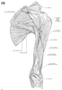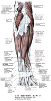 肘筋【ちゅうきん】 o: Posterior surface of epicondyle of lateral humerus. i: Posterior surface of ulna, proximal one-fourth. Extends the elbow joint. I: Radial nerve.(肘筋は、上腕三頭筋内側頭の外側部分の遠位への延長となっている。その線維は上腕骨外側上顆、関節包および外側側副靱帯に始まり、扇状に尺骨背側表面へ広がっている。)