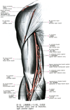 円回内筋【えんかいないきん】 Muscle that attaches on the pronator tuberosity of the radius. It flexes the elbow joint, acting as a pronator. I: Median nerve.(円回内筋の上腕頭は、前腕の浅層の屈筋群とともに上腕骨の内側上顆と内側上腕筋間中隔から起こる。発達の弱い尺骨頭は鈎状突起と尺骨粗面の間の尺骨内側面から起こる。円回内筋は尺骨と橈骨の上を斜走し、橈骨の前縁を回って、回外筋の停止部の下方の橈骨の前縁を回って、回外筋の停止部の下方の橈骨外側面につく。円回内筋は腕橈骨筋とともに肘窩の遠位側の境界となる。正中神経は円回内筋の上腕頭と尺骨頭の間を通る。)