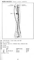 橈側手根屈筋【とうそくしゅこんくつきん】 o: Medial epicondyle of humerus, antebrachial fascia, i: Base of second metacarpal. Flexes and pronates elbow joint. Flexion and radial abduction of wrist joint. I: Median nerve.(橈側手根屈筋は上腕骨の内側上顆で浅層の屈筋群の共通起始部と、また同様に前腕屈筋および隣接する筋とを分けている結合組織中隔から起こる。筋は第2(しばしば第3)中手骨底に付く。羽状筋である橈側手根屈筋の長い腱は斜め下方に走り、橈骨の遠位1/3で橈骨動静脈の屈側に進み、屈筋支帯のしたのそれぞれ独自の管を通る。)