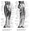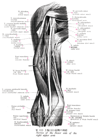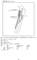 回外筋【かいがいきん】 o: Lateral epicondyle of humerus, radial collateral ligaments, anular ligament of radius, and supinator crest of ulna, i: Anterior surface of radius. Supination. I: Radial nerve.(回外筋は上腕骨の外側上顆、肘関節の外側腱索と尺骨の回外筋稜から起こる。薄い筋板は橈骨の外側を回り、後面から、橈骨粗面と円回内筋の停止部との間の橈骨の前面に付く。橈骨神経深枝はこの筋の近位辺縁近くで筋に入り、ラセン状の“回外筋管”を通って筋の遠位に抜ける。)