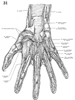 母指内転筋(手の)【ぼしないてんきん(ての)】 It attaches to the thumb, ulnar sesamoid bone, proximal phalanx, and dorsal aponeurosis. Adduction and opposition. I: Ulnar nerve.(母指内転筋は手掌腱膜、長指屈筋ならびに第1と第2虫様筋で被われ、2頭の起始を持つ。斜頭は手根骨、手根骨から放散する靱帯線維束および第2中手骨底から起こる。横頭は第3中手骨の掌側面から起始し、手掌の深部を横切る。両頭の総終末腱は近位中手骨指節関節の尺側種子骨と母指基節骨底に付く。この筋は内転筋で、母指を対立位にしたり屈曲したりするときに協力的に働く。尺骨神経の深枝(C8とTh1)から支配を受ける。)
