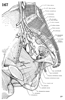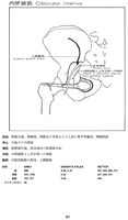 内閉鎖筋【ないへいさきん】 o: Internal surface of obturator membrane and surrounding area, i: Trochanteric fossa of greater trochanter. Lateral rotation, abduction, adduction. I: Sacral plexus.(内閉鎖筋と2つの双子筋は発生的にはひとまとまりである。内閉鎖筋はその起始を骨盤腔内へ移し、閉鎖膜上および閉鎖孔の骨性枠から起こるに至った。小坐骨孔縁(軟骨でおおわれている)が視点となり、内閉鎖筋包が介在し、ここで急に走行を骨盤外へ変える。骨盤の外にある部分は3分筋のうちの2頭、つまり上下の双子筋を多少なりともおおう。上双子筋は坐骨棘を発し、下双子筋は坐骨結節を発する。内閉鎖筋の停止腱の上下縁にはそれぞれ上下の双子筋が合流し、転子窩に終わる。骨盤内にある内閉鎖筋は強い内閉鎖筋膜に包まれ、これが肛門挙筋の起始となる。内閉鎖筋膜は肛門挙筋起始部では弓状をした腱様の筋膜束(肛門挙筋腱弓)で補強さえている。肛門挙筋腱弓よりも上で、内閉鎖筋は小骨盤の筋性壁をつくり、その筋膜は壁側骨盤筋膜の一部となる。これより下では内閉鎖筋とその筋膜は外側部において、骨盤底の下にある結合組織性の部位、すなわち坐骨直腸窩を区画する。)