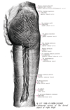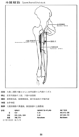 半腱様筋【はんけんようきん】 o: Ischial tuberosity. i: Medial surface of tibia. Extension at the hip joint. Flexion and medial rotation at the knee joint. I: Tibial nerve.(半腱様筋は大腿二頭筋長頭の起始近くの坐骨結節から起こり、鵞足を介して脛骨近位端内側面および下腿筋膜に終わる。半腱様筋は半膜様筋によってつくられた溝の中を遠位へ向かう。長い停止腱は大腿部ですでに始まり(ここから“半腱様”の名がつけられた)、鵞足の深層へと放散する。)