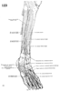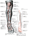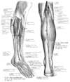 前脛骨筋【ぜんけいこつきん】 o:Lateral surface of tibia, interosseous membrane, deep fascia of leg. i: Medial aspects of medial cuneiform and first metatarsal. Dorsiflexion and supination of foot. I: Deep fibular nerve.(前脛骨筋は脛骨外側顆、脛骨外側面(近位2/3)、下腿筋膜および筋間膜から起始する。第1中足骨と第1楔状骨あたりの足底部に停止する。収縮中に筋腹は脛骨近位1/3の骨縁上に突出する。その腱は脛骨遠位1/3にかけて形成され、伸筋支帯の下を通って足の内側縁へ至る。その腱鞘は伸筋支帯より近位に始まり、距腿関節の関節腔のレベルにまで伸びている。腱鞘は前脛骨筋腱の遠位部および近位部浅層をおおい、中間部を包んでいる。前脛骨筋と長趾伸筋に対する近位の筋枝は深腓骨神経から同神経がまだ腓骨筋群を容れる部位を通っている内に分かれる。深腓骨神経が長趾伸筋を貫通してから遠位の筋枝が両筋の各々に行き(通常2条の)筋枝が母趾の伸筋へ行く。)