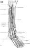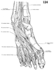長趾伸筋;長指伸筋(足の)【ちょうししんきん;ちょうししんきん(あしの)】 o: Lateral condyle of tibia, interosseous membrane, fibula, deep fascia of leg. i: Dorsal aponeurosis of the second through fifth toes. Dorsiflexion and pronation of foot. Extension of toes. I: Deep fibular nerve.(長趾伸筋は脛骨外側顆、腓骨前縁および骨間膜の狭い部から起こり、第2~5趾の足背腱膜へ至る。足背腱膜はその基本構造においては手指の手背腱膜と同じである(つまり、各腱の側縁束は末節骨に、中央束は中節骨に終わる)。足背筋膜は趾の部で完全に区分できるとは限らない。骨間膜の腱は通常基節骨にしか停止せず、虫様筋の腱索は第2~5趾の中節骨や末節骨に達するとは限らないので、第2~5趾の各関節を能動的に伸展することはしばしば困難となる。母指末節骨のみは長母趾伸筋の作用によって背屈することが可能である。)