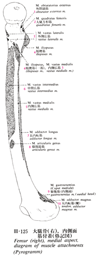 内側頭;脛側頭(腓腹筋の)【ないそくとう;けいそくとう(ひふくきんの)】 o: Proximal to the medial femoral condyle. i: Achilles tendon.(腓腹筋の内側頭は大腿骨内側上顆に起こり、アキレス腱に停止する。)