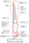 後脛骨筋【こうけいこつきん】 o:Tibia, fibula, interosseous membrane, i: Navicular, cuneiform bones I-III, and metatarsals II-IV. Plantar flexion and supination. I: Tibial nerve.(後脛骨筋は骨間膜の広い領域から起こる。狭い辺縁部は腓骨と脛骨の近位部に起こり、浅い線維束は浅深の屈筋間にある結合組織から起こる。後脛骨筋の腱は内果上方で長趾屈筋の腱の下を横切り(下腿腱交叉)、その主束は舟状骨粗面につき、その外側束は(しばしば)すべての遠位足根骨と第2~4中足骨底の足底面に付く。内果溝で後脛骨筋の腱は腱鞘に包まれ、内果下方では屈筋支帯におおわれている。深屈筋群へ脛骨神経の筋枝の中で後脛骨筋への枝はほかの枝よりもずっと近位、ヒラメ筋腱弓のレベルで出る。母趾とそのほかの趾への長屈筋群に対する近位の枝は下腿中位1/3へうつるレベルで脛骨神経から分かれる。脛骨神経からの筋枝は普通下腿遠位1/2からも分かれる。後脛骨筋は脛骨神経の支配を受ける。この筋の収縮により距腿関節における足の底屈、距骨下関節および横足根関節による足の内反が得られる。この筋は内層の縦足弓を維持するうえにも重要である。この筋の収縮が足底で数個の骨を互いに引き寄せるうえに役立つことにも注意すべきである。)