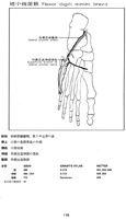 短小趾屈筋;短小指屈筋(足の)【たんしょうしくっきん(あしの)】 o: Base of fifth metatarsal and long plantar ligament, i: Proximal phalanx of little toe. Flexion and abduction of little toe. 1: Lateral plantar nerve.(短小趾屈筋と小趾対立筋は第5中足骨底、長足底靱帯および長腓骨筋腱鞘から共通腱をもって起こる。小趾の短屈筋は第5趾の基節骨底に、小趾の対立筋は第5中足骨外側面に停止する。人では対立筋は短小趾屈筋の弱い分束としてしか出現せず、その停止部でしか同定できない。外側足底神経の浅枝による支配を受け、中足趾節関節で第5趾を屈曲させる作用を示す。)