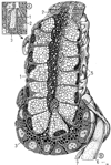 顎下腺【がっかせん】 Predominantly serous gland that is situated almost entirely beneath the mylohyoid muscle.(顎下線は顎舌骨筋の下で、下顎骨と顎二腹筋の間の三角形の窩(顎下三角)の中にある長さ2.5~3.5cm、厚さ約1.5cm、成人平均重量(一側)3.5~9.0gのやや扁平な楕円体。複合管状胞状線で、腺房は漿液細胞が大部分を占める混合性である。導管系は介在導管と線条導管が耳下腺、舌下腺に比べてはるかによく発達し、これらの導管上皮細胞には、管腔側に多少とも分泌顆粒様構造をもつことが多い。とくに齧歯目の顎下腺では、腺房は漿粘液性の分泌顆粒をもったただ1種類の細胞からなり、介在導管と線条導管の間には多数の分泌顆粒をいれた上皮細胞の一群がみられる。これを顆粒性膨大部(Granular convoluted tubes)または線条導管分泌部(secretory protion of striated duct)とよぶ。その発達は性ホルモン依存性で雌より雄がよく発達し(性的二形、sexual dimorphism)マウスやラットではこの部の総体積は終末部のそれを凌駕する。主としてマウスの顎下腺で証明された神経成長因子、上皮成長因子、レニン、カリクレインなどの特蛋白は、この部分で産生放出されると考えられている。顎下腺管(Ductus submandibularis) (Wharton's ductともいう)は大舌下腺管とともに舌下小丘に開く。血管は顔面、舌動脈の枝が、神経は鼓索神経が顎下神経を経て、また血管を介して交感性線維が分布する。)