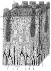 気管【きかん】 Elastic tube between the larynx and bronchi.(喉頭の下に連なる気道の管状部で、第6頚椎の高さにはじまり、気道の前を垂直に下り、第4頚椎の前で左右の気管支に分岐する。この分岐部を気管分岐部という。気管支鏡で分岐部を上から見ると、その正中部に左右の気管支を隔てる高まりがある。この高まりを気管竜骨という。気管壁には、硝子軟骨性の気管軟骨の輪が一定の間隔をおいて重なり、軟骨間は輪状靱帯で結合する。気管軟骨は幅3~4mmで15~20個を数える。気管軟骨は完全な輪ではなく、全周の4/5~2/3を占める馬蹄状を呈する。軟骨性の支柱を欠く部は正中部後壁をなし、膜性壁とよばれる。膜性壁には平滑筋(気管筋)を含む。気管内面は多列絨毛円柱上皮で、絨毛の運動の方向は上向きである。粘膜固有層には弾性線維が多く、粘膜下組織には胞状の混合腺(気管腺)を数多く含む。日本人の気管の長さは10cm前後である。)