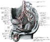 精巣上体;副睾丸【せいそうじょうた;ふくこうがん】 Lying on the posteromedial surface of the mediastinum of testis, it serves to store spermatozoa.(精巣上体は副睾丸ともいい、精子を精巣から精管へ送る通路である。精巣の上端から後縁にかけてこれに接し、共通の皮膜に囲まれる。重量的2g。精巣上端に近い方から、精巣上体頭、体、尾の3部を分け、精巣上体尾は精管に移行する。頭は迂曲する精巣輸出管を含み、各輸出管は結合組織で仕切られて、精巣上体小葉をつくる。最上位の精巣輸出管に他の管が合流し、1本になったものが精巣上体間で、これが頭からはじまってきわめて迂曲し、体尾を構成する。これがそのまま精管に移行する。)
