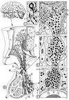 下垂体【かすいたい】 Gland located in the sella turcica.(下垂体は間脳の視床下部から下方に突出する漏斗に連なる内分泌腺である。蝶形骨のトルコ鞍の下垂体窩に位置する無対の小器官で、大きさは前後径約0.5cmで、重さは男性約0.5g、女性ではそれよりやや重い。このような小さい器官であるが、10種類近くのホルモンを分泌し、全身のいろいろな器官の働きを調節している。下垂体は2種のまったく異なった由来をもつ組織が結合してできたもので、腺下垂体と神経下垂体とよばれる。前者は胎児の咽頭上壁が上方に膨出Rathke嚢から生じ、後者は第三脳室の底部である漏斗が下方に伸びだして生じたものであり、両者は厳密に結合している。一般に腺下垂体を前葉、神経下垂体を後葉と呼んでいる。Hypophysisは、「~の下に」を意味するギリシャ語の接頭詞hypoに、「成長する」という意味のギリシャ語phyeinを付けたもので、「下に向かって成長したもの」という意味である。)
