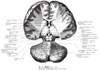 松果体;松果腺【しょうかたい;しょうかせん】 It develops from the roof of the diencephalon and overlies the tectal plate.(松果体は円錐形の小体で、後交連の領域で、第三脳室の天井に付着している。これは痕跡的な腺であるらしく、血管の豊富な結合組織の小柱の網工からなり、その網眼の中には神経膠細胞および松果体細胞pinealocytesあるいはepiphysial cellがみられる。サルの松果体細胞はセロトニン(5-HT)とコレシストキニン(CCK)を含んでいる。哺乳類の松果体細胞は、系統発生学的には、感覚神経性光受容体の要素と関係しており、これは、分泌細胞になる物が多いが、間接的に光受容性をもっている。これらの突起の棍棒状をした終末は、血管血管を取り囲む血管周囲腔に接して終わる。松果体の分泌のうちで最もよく知られた物は、セロトニン、ノルアドレナリンおよびメラトニンという生体産生アミンであるが、その他に、サイロトロピン遊離ホルモン(TRH)、黄体形成ホルモン遊離ホルモン(LHRH)およびソマトスタチン(SRIF)のような、視床下部で形成されると同定されたペプチドを、かなりの濃度で含んでいる。セロトニンは、松果体細胞の中で合成されて細胞外の隙間に放出される。ノルアドレナリンは、松果体の実質細胞に終止ししている交感神経ニューロンの中で合成される。松果体は、昼間光の変動に敏感なN-アセチルトランスフェラーゼおよびヒドロキシインドール-o-メチルトランスフェラーゼという2つの酵素の働きによって、セロトニンからメラトニンを合成する。メラトニン合成の毎日の変動は周期性であり、光入力の毎日の周期に直接関係している。光は、日周期を環境の光周期に一致させる。そして、さらに、まだ確認されていない経路を経て、神経性信号が松果体に運ばれることを速やかに遮断するように働く。N-アセチルトランスフェラーゼの活性は、昼夜に高められるが、光にさらすと、酵素の活性が失われる。視床下部の視交叉上核を両側性に傷害すると、この核は網膜視床下部経路を受けているので、松果体のN-アセチルトランスフェラーゼにおける周期がなくなり、その結果、ヒドロキシインドール-o-メチルトランスフェラーゼの活性のレベルが下がる。そのような傷害によって、自発運動の活性の日周期および栄養補給と水飲み行動の両方の日周期がなくなる。雄のネズミでは、視交叉上核の傷害によって、正常な発情周期がなくなる。網膜視床下部路は、視交叉上核の構造との直接の相互作用によって、松果体のはたらきを変える。環境の光は、日周期をその周期に一致させる働きと伝達する働きをもっているとみなされ得る。内在性振動発生装置を光周期にのせるための光後下はゆっくりであるが、信号伝達に及ぼす光の後下は速やかである。そして、それによって、光によってN-アセチルトランスフェラーゼが速やかに“消失”することと、持続光によって日周期が妨げられることを、おそらくは説明できるであろう。視交叉上核からの単一神経路が、松果体によるメラトニン形成に関係する両酵素を調節しているが、これらの結合についての詳細は、なお、あきらかになっていない。間接的に証明された根拠は視交叉上核から松果体への神経路には、視床下部の灰白隆起の領域、内側前脳束および中間質外側路への中継路が含まれることを示唆している。このように、松果体は、交感神経ニューロンを経て受けた信号をメラトニンという内分泌物に変換させる、神経内分泌変換体ともいうべきものであるらしい。松果体の分泌は視床下部の働きを変化さえるが、それは、内分泌が心身の血液循環あるいは、脳脊髄液に入ってからののちに作用する。松果体のセロトニンとメラトニンの日内変動は、光入力の周期に応じて起こる。松果体活動のこれらの周期性変化は、この腺が生物学的時計としてはたらいて、生理学的過程と行動学的過程とを調節する信号を出していることを示唆している。これらの変動は日周期circadian rhythmsと呼ばれ、環境からの刺激が存在すれば、ほぼ24時間周期を示すだけである。松果体実質の腫瘍は、性的機能を低下させて思春期を送らせるが、他方、松果体を破壊するとしばしば早発思春期を伴う。これらの観察は、松果体が、性腺および生殖器系に抑制的影響を及ぼすことを示す実験的研究の結果と一致する。)