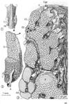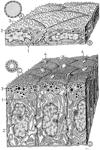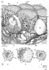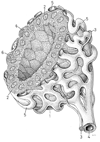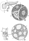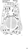 甲状腺【こうじょうせん】 Produces thyroxine and triiodothyronine, hormones that increase metabolic processes. Pathological enlargement is known as goiter.(甲状腺は前頚部の後頭前側にある不規則な楕円形嚢胞からなる内分泌腺で、成人で25~40gである。甲状腺は舌根の上皮が落ち込んで生じた原基が、下の方へ伸びだして出して現在見る位置に落ち着いたものである。舌根の陥入部の名残りが盲孔であり、移動経路に尾を引いて残った原基が発達したものが錐体葉である。この一部が筋組織から成るmのを甲状腺挙筋という(出現率20~30%)。甲状腺挙筋が存在する場合は、舌骨または甲状軟骨から起こって甲状腺に停止している。甲状腺は2種類のまったく異なったホルモンを分泌する。主な甲状腺ホルモンはヨウ素を含むアミノ酸誘導体で全身の物質代謝を亢進させる。1分子に含まれるヨウ素原子の数によって、T4(チロキシン)とT3(3-ヨードチロニン)を区別する。もう一種の甲状腺ホルモンはポリペプチドでカルチトニン(またはチロカルチトニン)という、血中カルシウムイオンの濃度を低下させるホルモンである。ヨウ素をふくむホルモンは甲状腺濾胞を形成する濾胞細胞から分泌され、カルチトニンは濾胞の間あるいは濾胞の周辺に存在する濾胞傍細胞から分泌される。濾胞は甲状腺の構造単位であって中空球状の細胞集団であるが、細胞はその周辺に1層にならんでいるだけで、内腔はコロイドという濃厚な蛋白溶液で満たされている。この蛋白はチログロブリンとよばれ、ヨウ素を含む糖蛋白である。濾胞[上皮]細胞は機能状態によって形が異なり、単層立方または単層円柱上皮が普通であるが、コロイドが極端にたまっているときは、単層扁平上皮となる。この細胞はよく発達した粗面小胞体とGolgi装置をふくみ、糸球体も被い。分泌物はGolgi装置で径150~200nmの小果粒あるいは小胞につめこまれて、濾胞内腔に近い細胞表面の知覚に運ばれる。これは細胞先端部あるいはそのやや下方に集まっていることが多いので、subapical granule(またはvesicle)とよばれる。この果粒は開口分泌によって、その内容を濾胞腔に放出すると思われる。甲状腺が下垂体前葉ホルモンの一種であるTSH(甲状腺刺激ホルモン)によって刺激されると、細胞表面に偽足状の突起が現れて、コロイドを貪食する。そのようにして貪食されたコロイドをふくむ空胞を、コロイド滴という。これに水解小体が融合して、加水分解酵素を得ると、コロイド滴内でチログロブリンが分解され、甲状腺ホルモンであるT4およびT3が生ずる。これらのホルモンは低分子であるから、細胞内を拡散して、基底側に運ばれ、濾胞に近接して分布している毛細血管に吸収されるのである。濾胞傍細胞は動物によって発達が異なり、ヒトでは非常に少ない。細胞質が明るくみえるので、clear cellの略としてC-cellとよばれることがある。これは鰓後体に由来する細胞で、血中カルシウムを低下させるホルモンを分泌する。濾胞細胞のやや外方に位置するが、共通の基底膜で包まれる。しかし、この細胞は濾胞腔に面することはない。径200nm前後の小果粒を多数含んでおり、動物にカルシウムを注射するとこの果粒が著明に減少することから、カルチトニン産生細胞であることがわかった。この果粒は一般のペプチドホルモン産生細胞であることがわかった。この果粒は一般のペプチドホルモン産生細胞と同様に、Golgi装置で産生されて、細胞基底部(基底膜に面する表面)から、開口分泌の様式で放出される。)