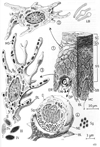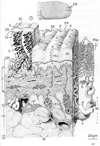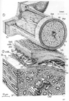 毛細管;毛細血管【もうさいけっかん;もうさいかん】 (毛細血管は、細動脈と細静脈の間にあって、多くの分枝、吻合を繰り返し、組織中を網目状に走行する、非常に細い血管である。その直径は8~10μmで、赤血球より幾分大きい程度である。毛細血管壁は内腔をつつむ1~3個の内皮細胞と、その外側にまばらに分布する周皮細胞とから構成されている。細動脈から毛細血管への移行は、中膜における平滑筋細胞の有無により、はっきりと区別されるが、毛細血管から細静脈への移行は徐々に生じ、両者を明確に区別することは困難である。多くの分枝吻合により、毛細血管網における血管表面積は、非常な増大を示す。表面積の増大とともに、血流に対する抵抗も大となり、血液はこの部位を、非常にゆっくり流れることになる。大動脈では血液は、平均320mm/sで流れるのに対し、毛細血管ではその約1/1000程度の速さでしかない。血液はゆっくりと流れながら、増大した血管内腔面に十分ふれ、薄い血管壁を介して、十分な物質交換を行うことになる。毛細血管壁の構造は、光顕による観察から、すべて同じと考えられていたが、電顕的には、主として内皮細胞の違いから、さらに3つに分けられることがわかった。それらは、連続型毛細血管、有窓型毛細血管、洞様毛細血管である。①連続型毛細血管continuous capillaryは最も普通にみられる毛細血管である。筋肉や結合組織、脳など、体の多くの部位に分布する。内皮細胞の核は核の部位でのみ厚く、その周囲は、連続した薄い細胞質よりなる。その厚さは通常0.1~0.2μm程度である。細胞質には細胞膜の陥入や、これらが中へ落ち込んで生じたと思われ60~70nm径の小胞がほとんどみられないものもある。血管壁の浸透性と関係があるようである。細胞と細胞の連結部では、細胞膜は一定の間隙を隔てて、まっすぐに、あるいはジグザグにかみ合っている。内腔側には閉鎖結合もみられる。またこの連結部には、内腔に向かって突出する、内皮細胞のヒダが時に観察される。これは辺縁ヒダmarginal foldとよばれるが、その機能については明確でない。基底膜は、内皮細胞の外側を完全におおっている。②有窓型毛細血管fenestrated capillaryは、内皮細胞の核部以外の、周囲に伸びる細胞質は連続型のものよりもっと薄く、かつ、その部位に、直径60~80nm程度の多くの孔が存在する。時にはもっと大きな径を示すものもある。腎臓、内分泌腺、超粘膜など、物質透過の盛んな部位に多く見られる。腎糸球体における毛細血管では、孔は、血管腔側と基底側の間を完全に通過するが、普通は、孔の途中に非常に薄い1層の隔膜が横切り、孔を閉ざしている。この隔膜の性質および機能については明らかでない。物質透過の際のフィルターの役割を果たしているのかも知れない。孔は、一定間隔に規則正しく配列するが、内皮細胞全体に一様に分布するのではなく、幾分細胞質の厚い、全く孔の存在しない部位が帯状に伸び、細胞表面を幾つかに区切っている。孔の分布の状態、数は組織により多様である。内皮細胞の外側にある基底膜は、連続型の場合と同様、孔に関係なく全体をつつむ。③洞様毛細血管は類洞ともよばれ、内皮細胞は器官を作る実質細胞に沿うようにして並び、したがって、その横断像は必ずしもまるくなく、不規則な形を示す。太さは多様であるが、他の型の毛細血管に比べ、かなり広い管腔をもち、その中を血液は、ゆっくりと流れることができる。内皮細胞には、その細胞質を貫通する、かなり大きな孔を有するものや、かなり開いた細胞間隙を示すものがあって、それらの部位を、巨大な物質も容易に通過することができる。基底膜はあまり発達せず、不連続な物やあるいは全く欠くもものもある。洞様毛細血管は、肝臓、脾臓、骨髄などでしられるが、内皮細胞は、各組織に固有の形態を示す。④毛細血管の透過性と構造との関係は毛細血管およびこれにつづく細静脈は、血管壁を通して、血液と組織の間で物質交換を行う部位である。心臓から毛細血管に至るまでの動脈、そして心臓へと戻る静脈は、いわば血液の通路であり、毛細血管網および細静脈の領域において初めて、血液循環の本質的な機能が含まれることになる。毛細血管では、内腔表面積は非常に増大し、総表面積が6,000m2、横断面績の総和は、大動脈のほぼ800倍にも相当するという。血液はこの広い内宮面にふれながら、うすい内皮細胞と、基底膜を通して、物質の交換を行うことになる。水や電解質など低分子物質は、これらの部位を静水圧や浸透圧、濃度勾配の差によって、自由に通過しうるが、これだけでは、組織を維持するのに十分とはいえない。蛋白質のような高分子物質は、直接膜を通過することはできず、これらが膜を通過するためには、特殊な機構が必要である。)