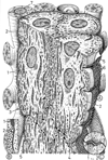 刺激伝導系;心臓刺激伝導系【しげきでんどうけい;しんぞうしげきでんどうけい】 It is located in the myocardium beneath the endocardium.(心臓を構成する心筋細胞には、自発的に興奮と収縮を一定の周期をもって繰り返す能力をもつ心筋細胞(特殊心筋細胞)と実際上これをもたないといえるもの(一般心筋細胞)が含まれており、特殊心筋細胞の禅宗断を刺激伝導系と称する。刺激伝導系のなかに通常四つの部分、すなわち洞房結節、房室結節、His束(房室束)、Purkinje線維、を区別する。これらのうち後3者は順につながった状態で心臓内に存在する。洞房結節は、上大静脈が右心房にそそぐ開口部付近に存在する特殊心筋細胞の集団である。ここの特殊心筋細胞が示す自発的興奮・収縮の周期は他のいずれの刺激伝導系部分をなす特殊心筋細胞のそれよりも短く(つまり最も頻繁に興奮・収縮を繰り返す)、心臓全体の拍動リズムを決定するペースメーカーとしての役割を洞房結節が担うこととなる。洞房結節は胎児期に存在していて、次第に右心房の壁の中に取り込めれてしまった静脈洞部分と右心房固有部分との境界にこの結節が出来てくることによる。房室結節と称されることもある。この結節をつくる特殊心筋細胞のリズムは洞房結節をつくる特殊心筋細胞のそれの約半分の速さであるが、残りの刺激伝導系部分のリズムより早いので、洞房結節が機能不全に陥った際には房室結節が二次的ペースメーカーとなり、心臓全体の拍動リズムを支配するようになる。房室束は房室結節からはじまり心室中隔の頂部にまでいたる部分であり、心室中隔の右側表面と左側表面に沿ってそれぞれ下行する右脚と左脚とに分かれる。)